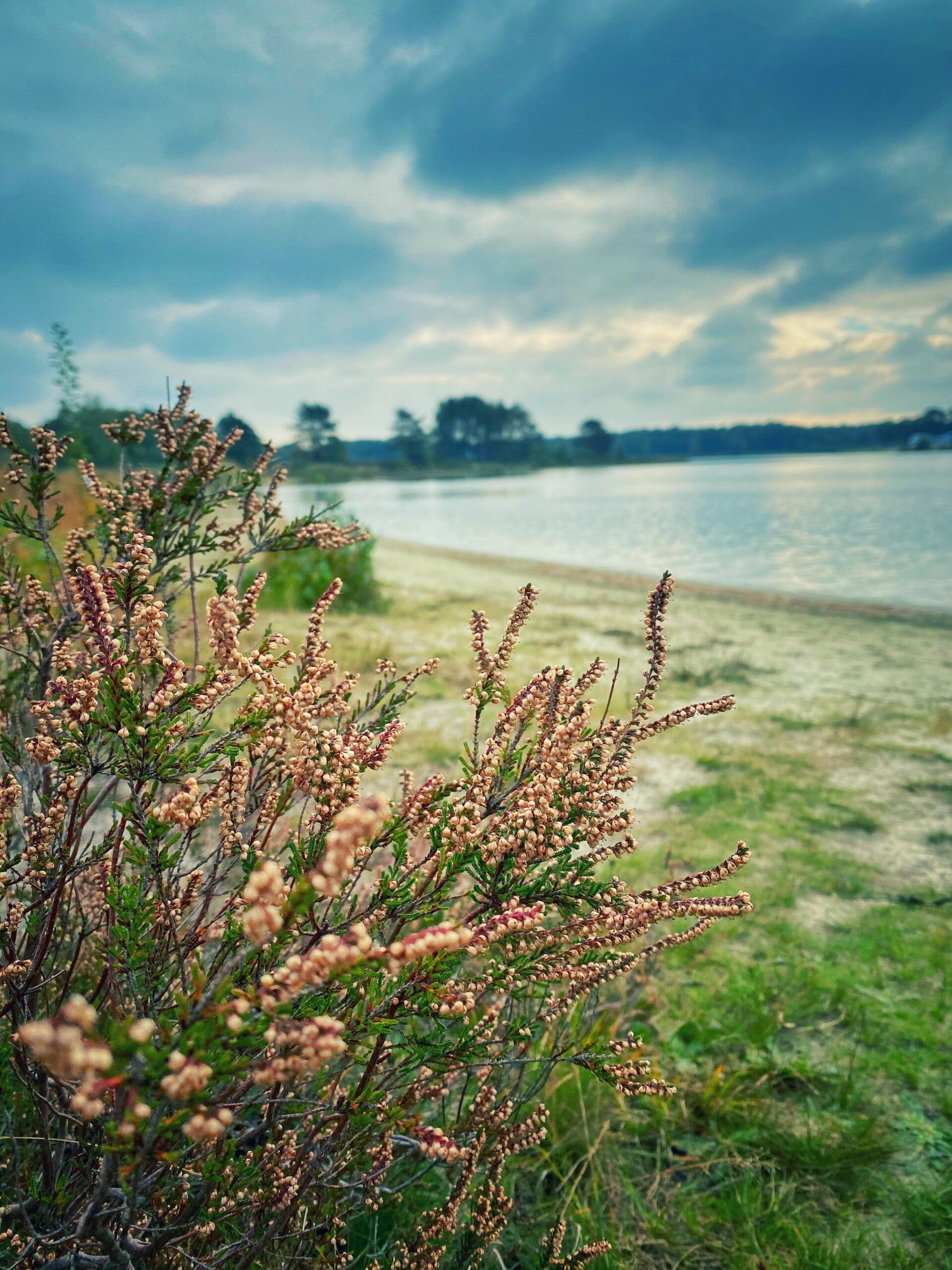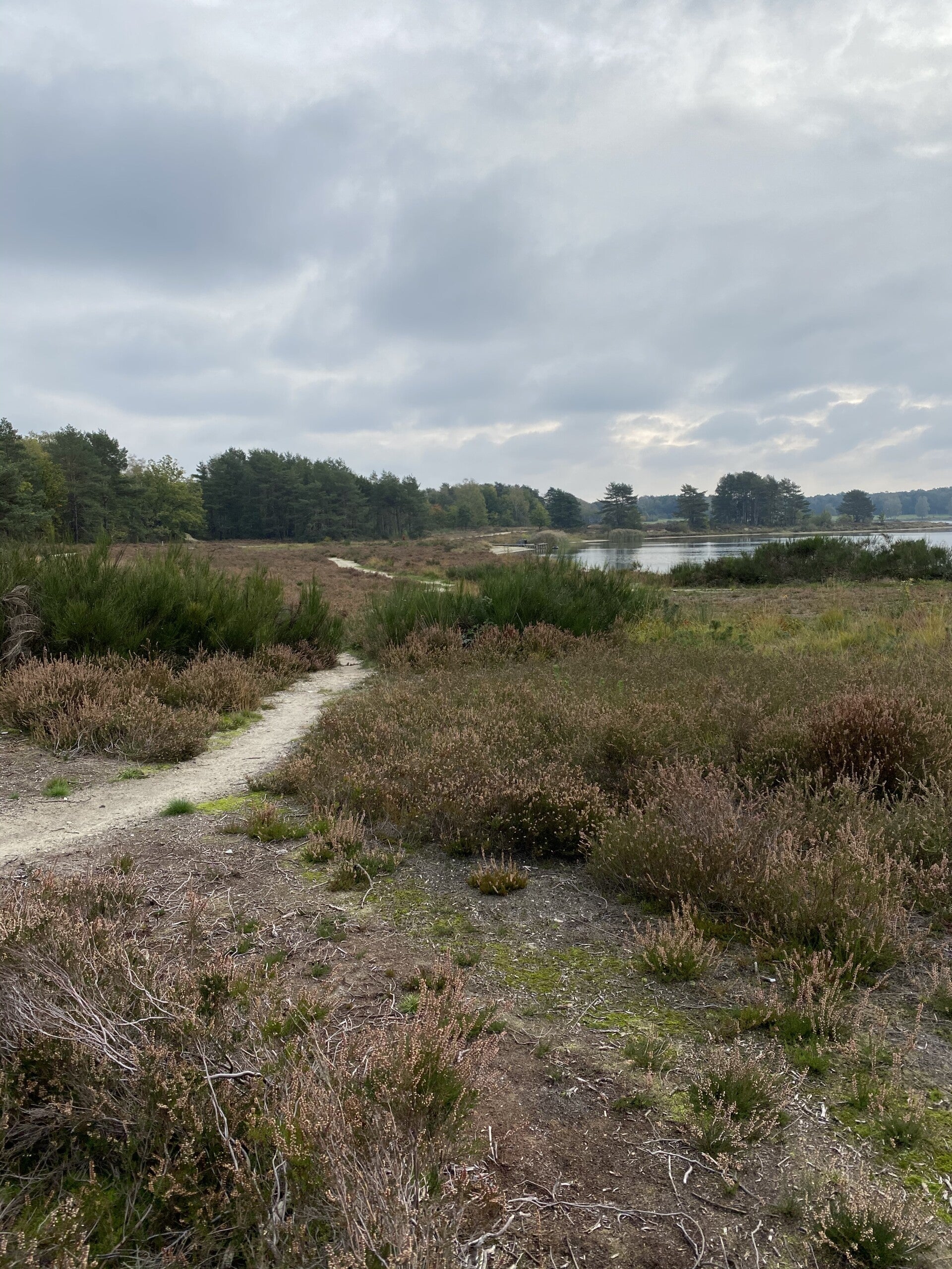 Mijn wandeling begon door hoge bomendreven. De herfst was er volop aanwezig want talrijke paddenstoelen doken langs de bosrand op. De wandelpaden waren bezaaid met een goud-bruin bladerdek waardoor ik heerlijk kon schoffelen. Eenmaal het bos uit wandelde ik door de heide naar de grote waterplas toe.