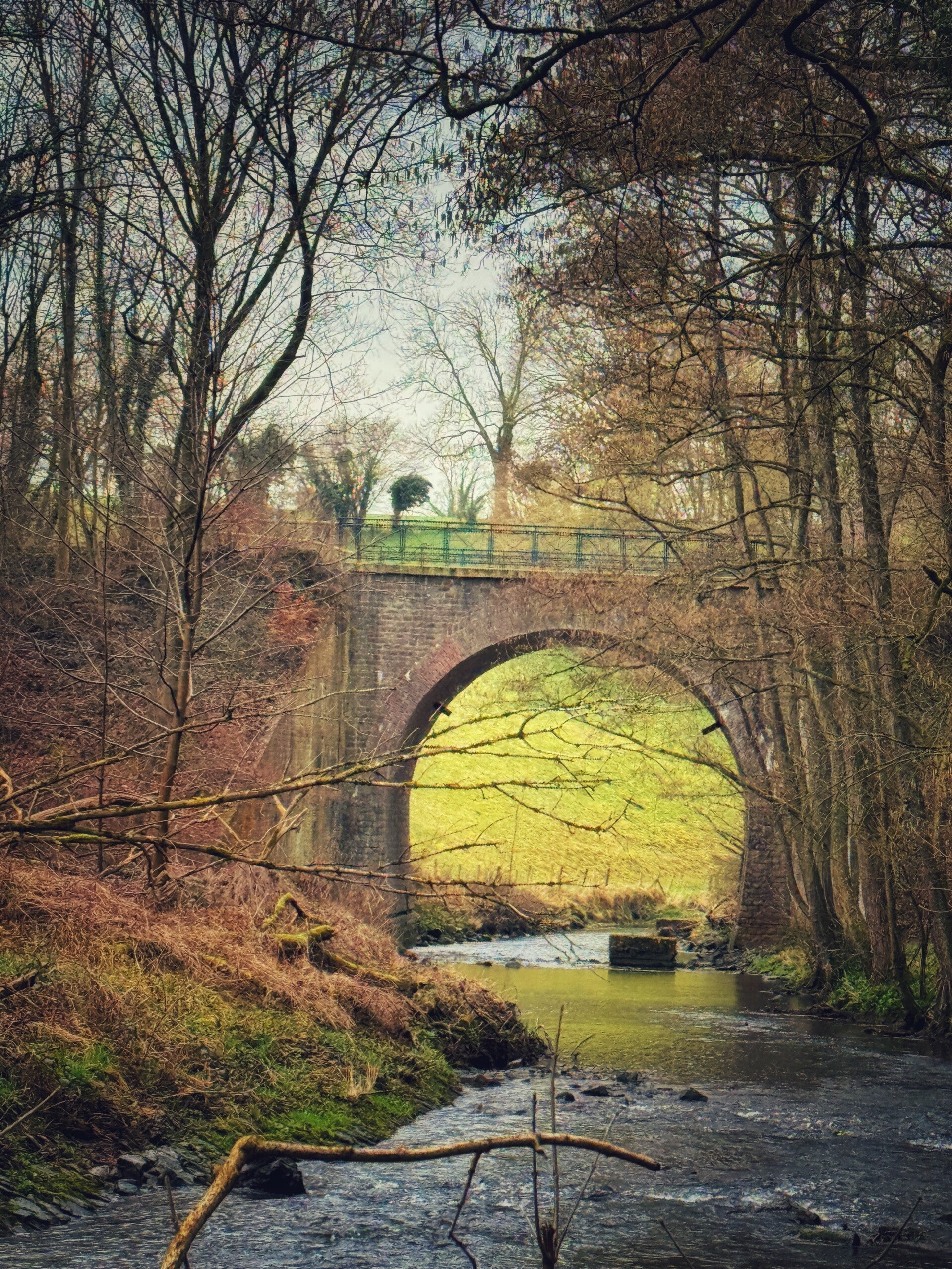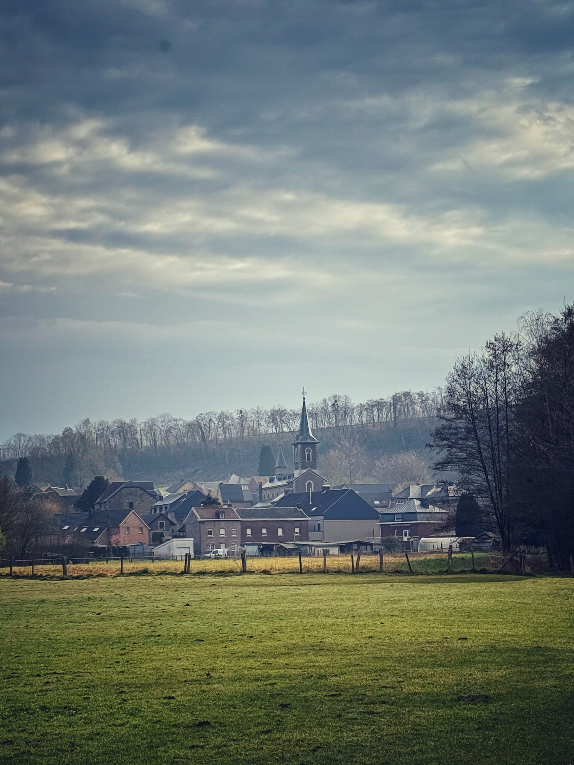 Wij parkeerden onze wagen net buiten het centrum van Moresnet-Chapelle, aan een verzorgingstehuis. Van daaruit begint de wandeling meteen rustig: eerst een stukje door de weilanden richting het centrum. Al snel verschijnt een opvallend element in het landschap. Boven het dorp loopt een indrukwekkende spoorwegbrug die het uitzicht domineert. Die combinatie van het kleine dorpscentrum met zo’n grote spoorlijn erboven zorgt voor een bijzonder beeld.