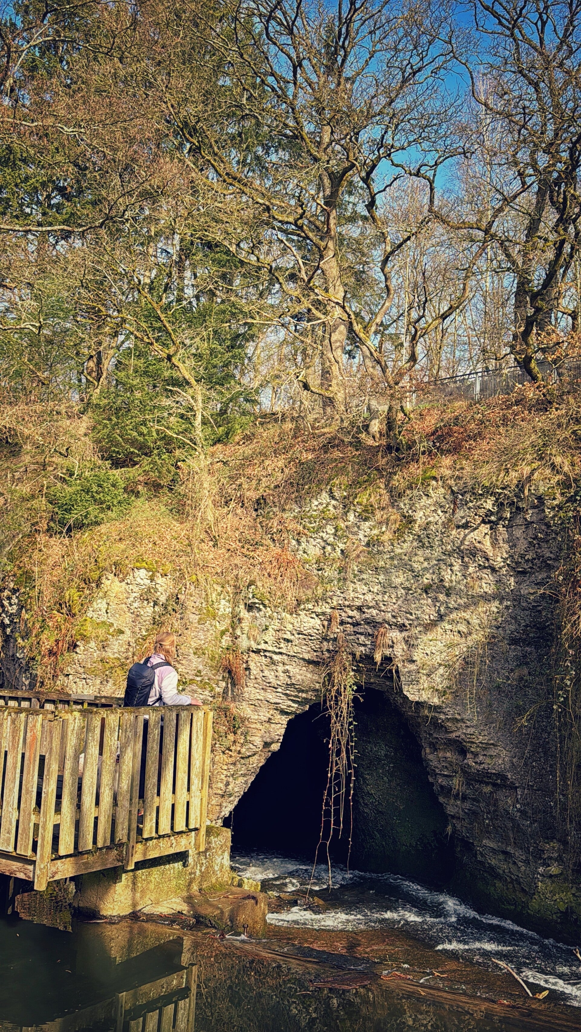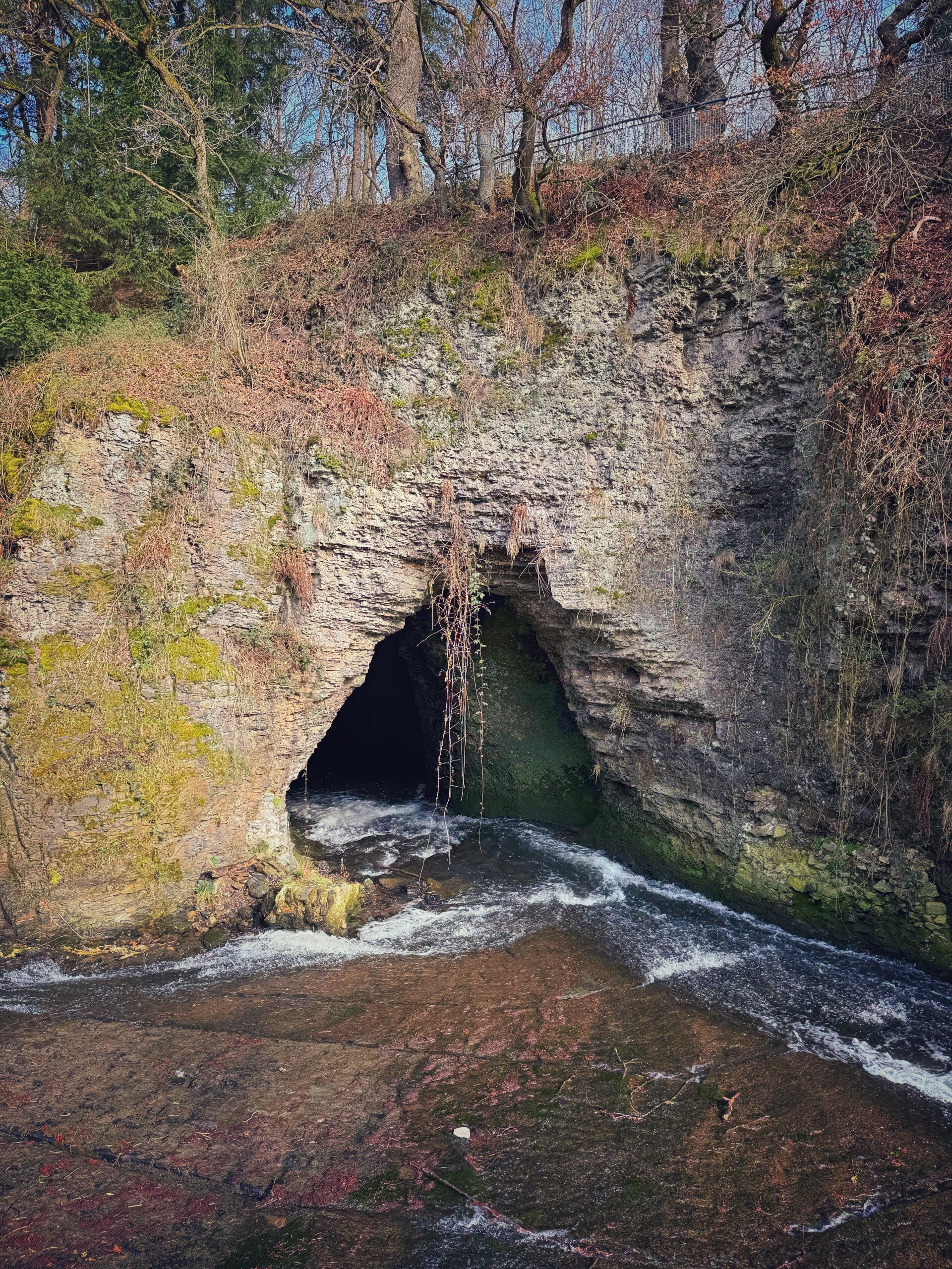 Een bijzonder punt op deze plek is de rotstunnel waar de Geul doorheen stroomt. Via een klein houten platform krijg je een mooi zicht op het water dat door de rotsen verdwijnt en weer verschijnt. Een unieke plek waar natuur en geschiedenis elkaar raken.