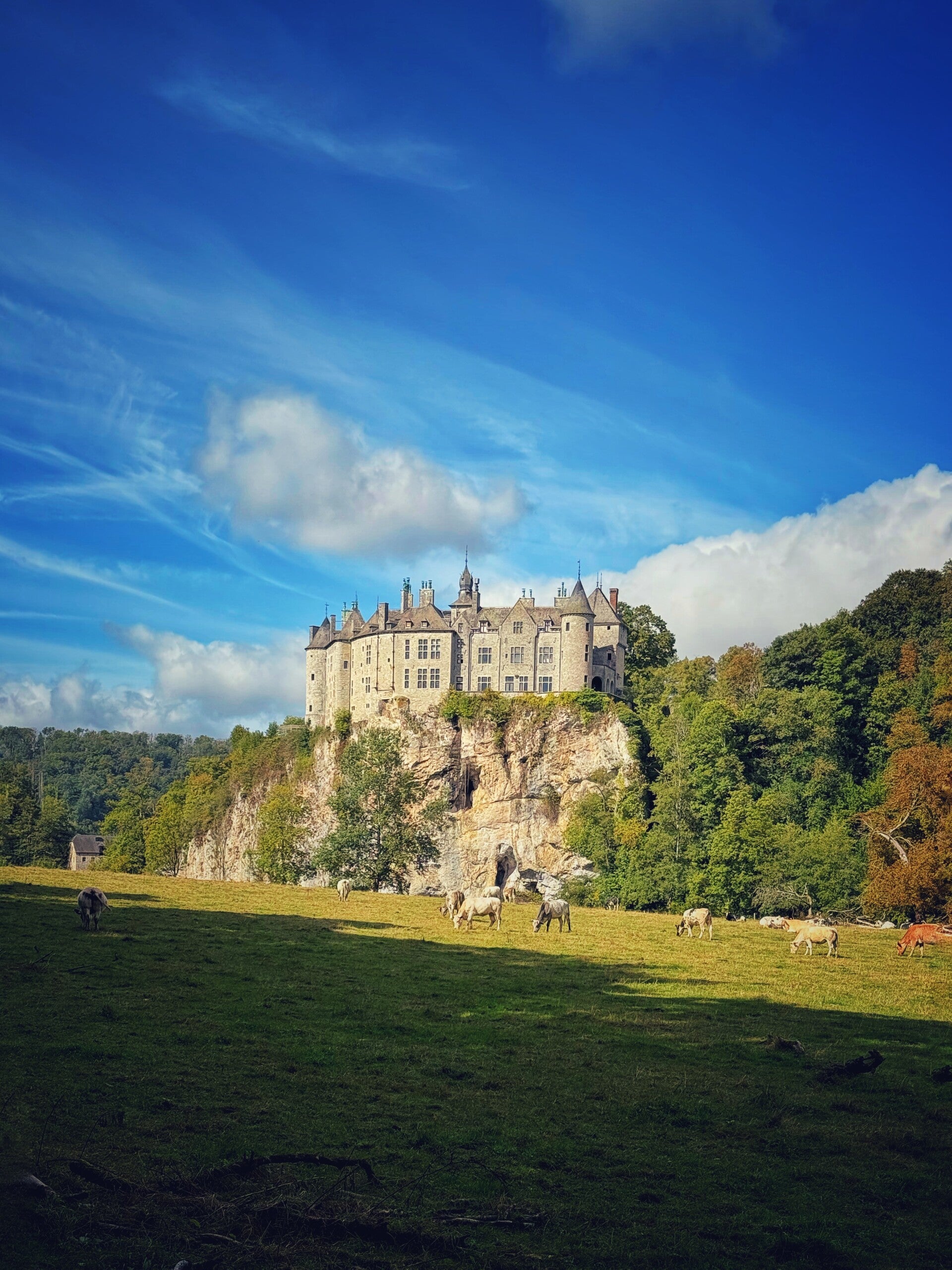 Een kleine zijsprong brengt je naar het Kasteel van Walzin, dat je in de verte ziet opdoemen tussen de weilanden waar de koeien rustig grazen. Vanaf dit punt zie je ook kajakers hun bochten nemen in de Lesse, een mooi contrast tussen natuur en activiteit.