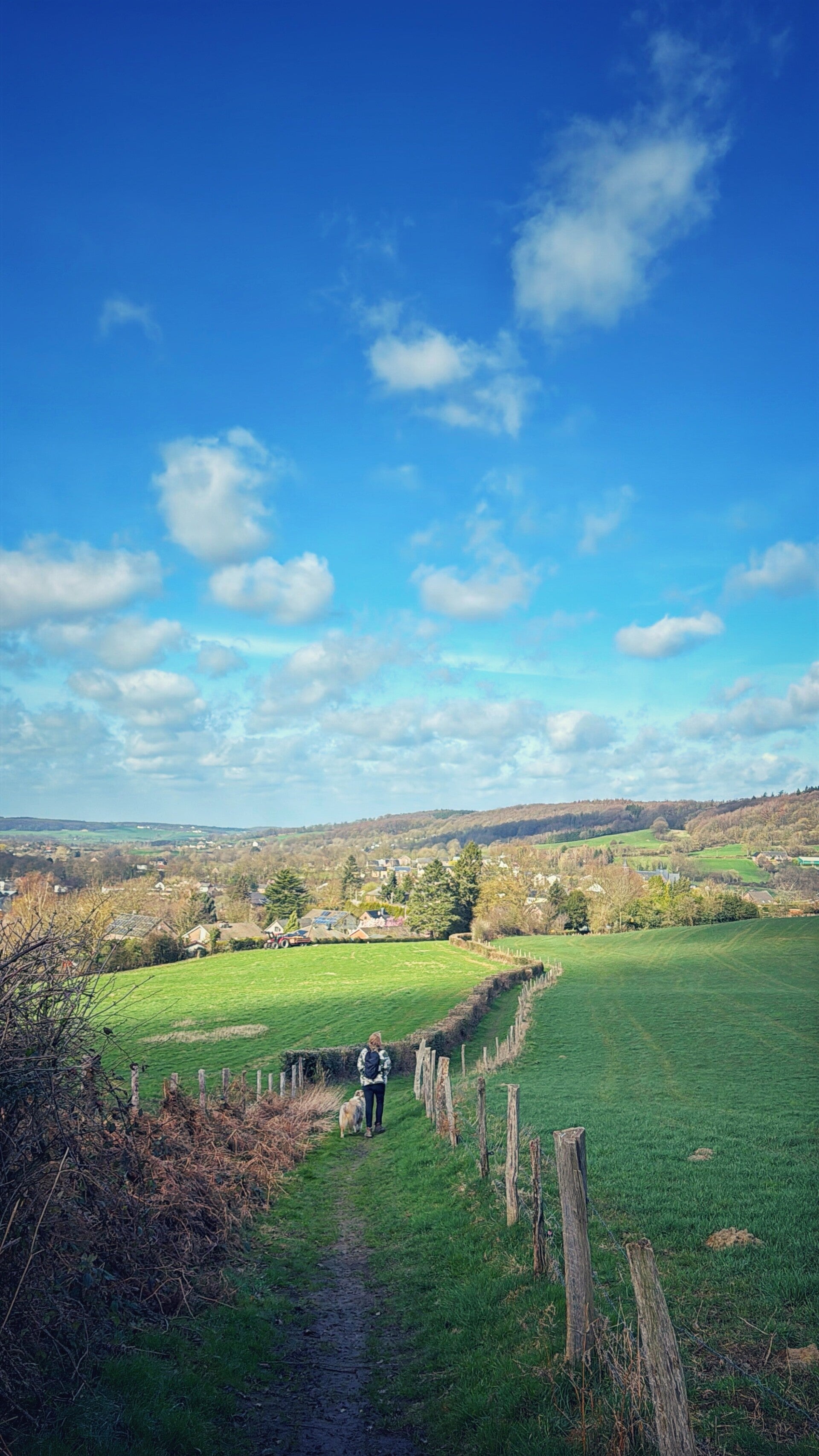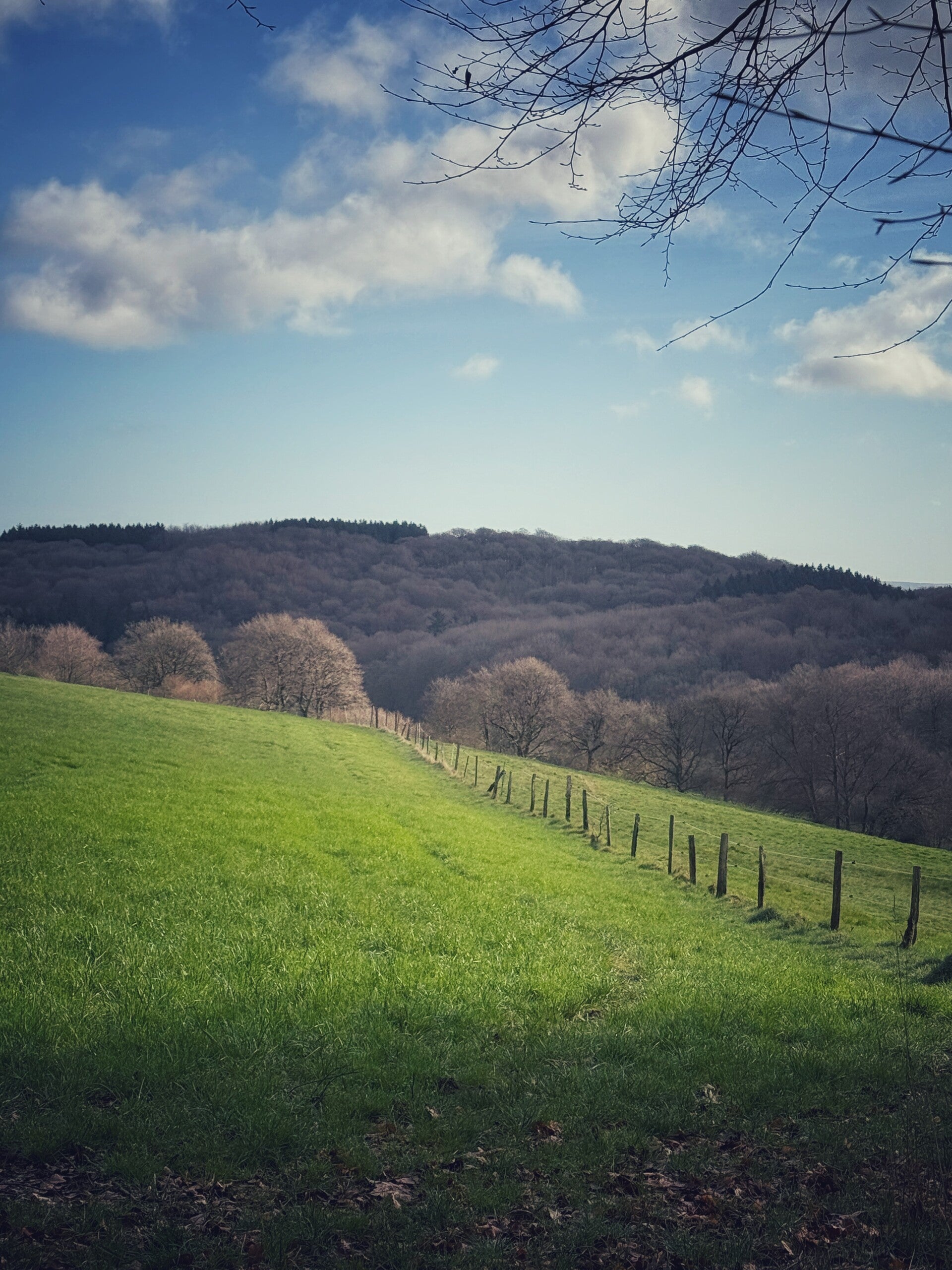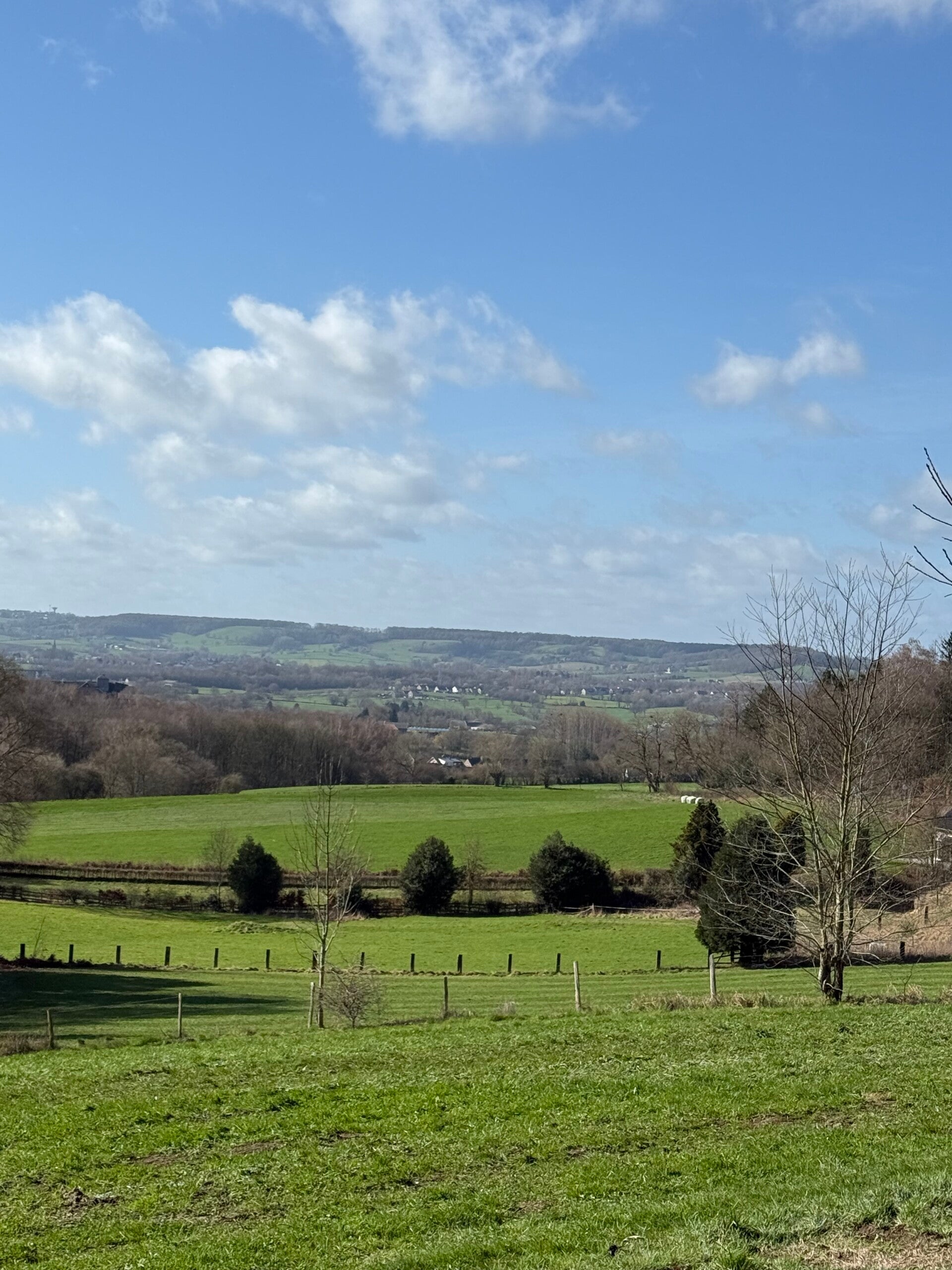 Na een tijdje veranderde het landschap plots. We liepen onder een spoorlijn door en kwamen uit het bos. En daar gebeurde iets moois. Het landschap opende zich volledig. De bossen maakten plaats voor uitgestrekte velden en zachte heuvels met prachtige vergezichten. Tegelijk verscheen ook opnieuw wat duidelijkere bewegwijzering, waardoor we eindelijk zonder constant op onze gsm te kijken verder konden wandelen. Vanaf hier begon het echt genieten.