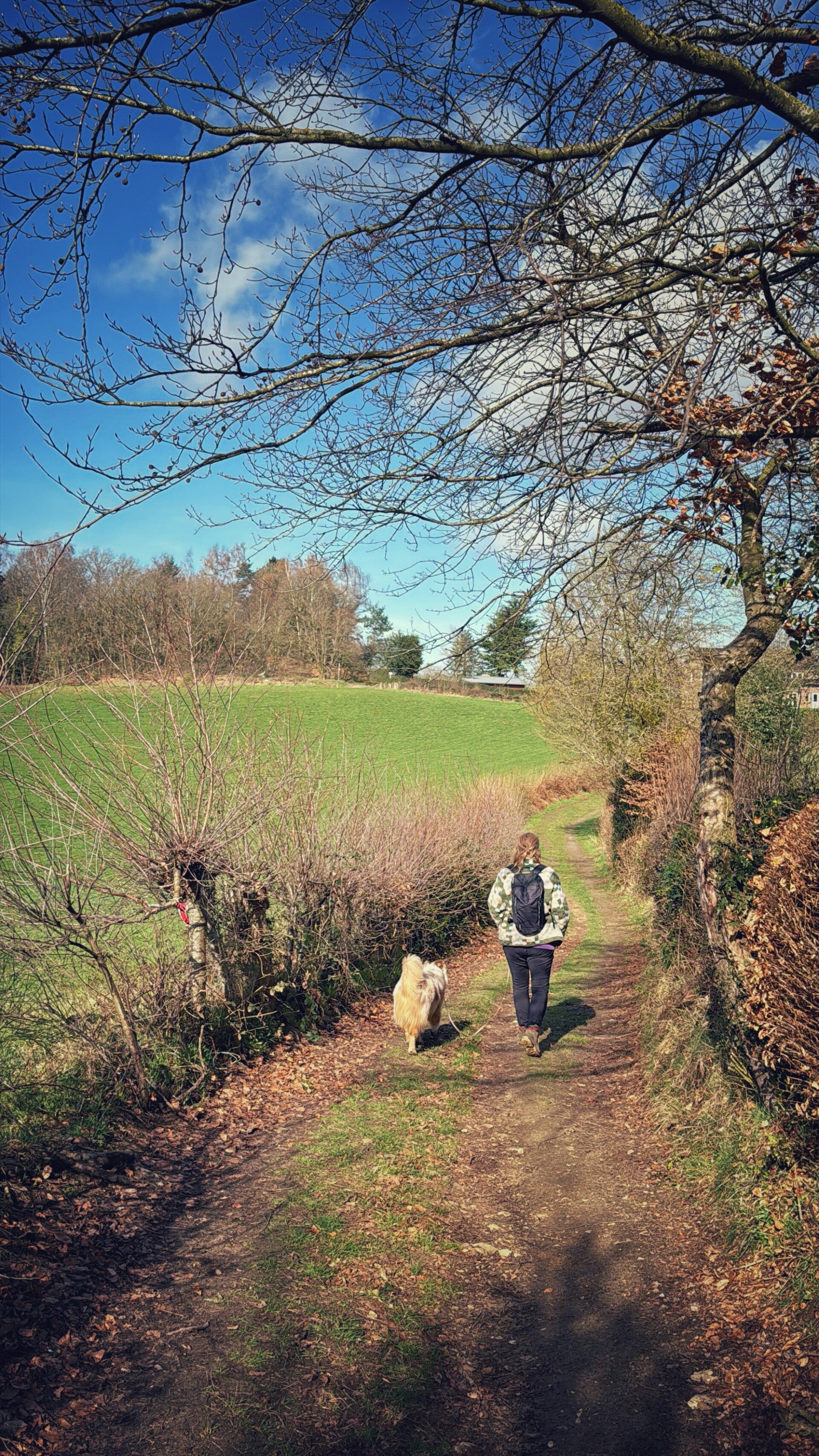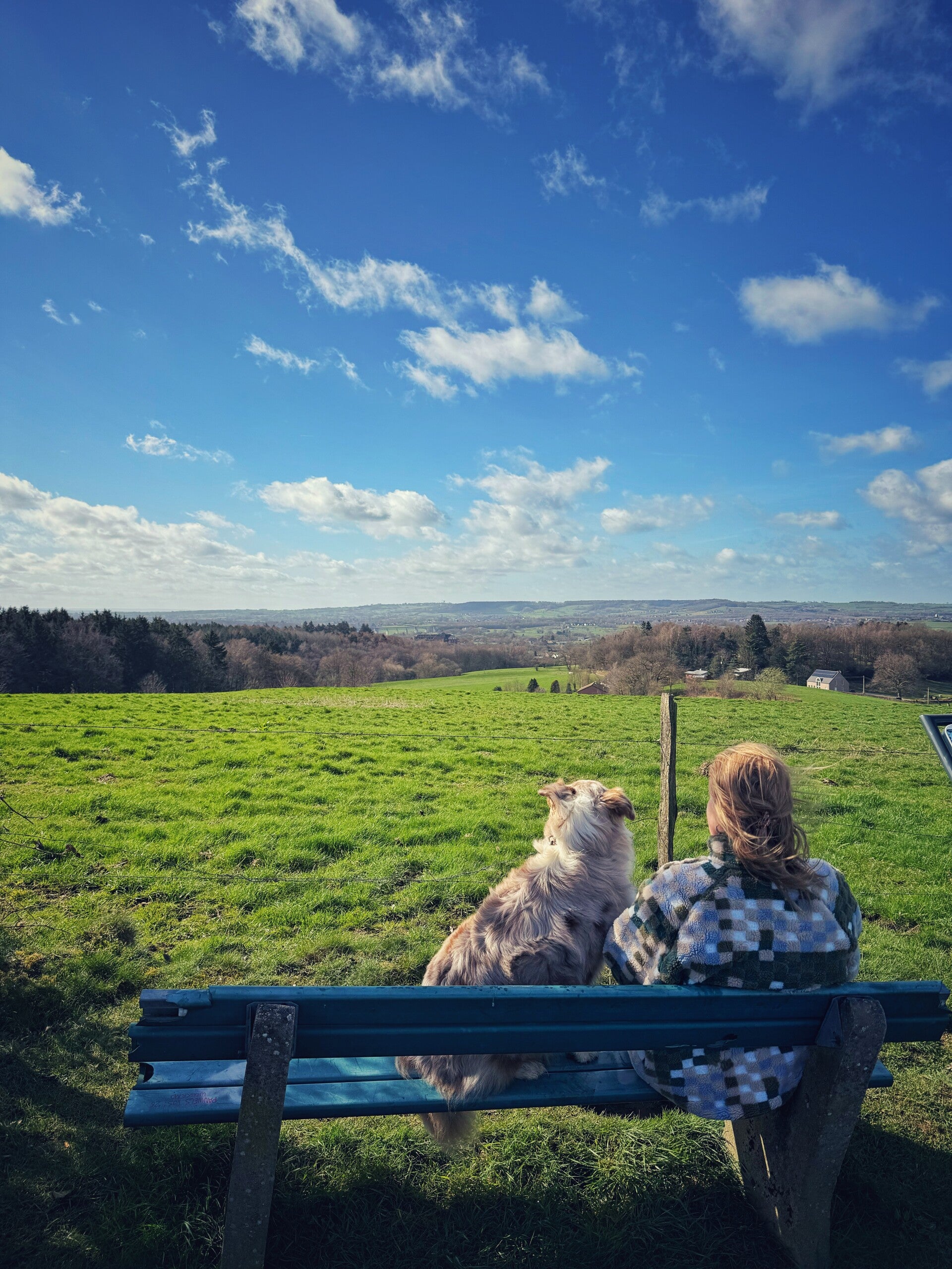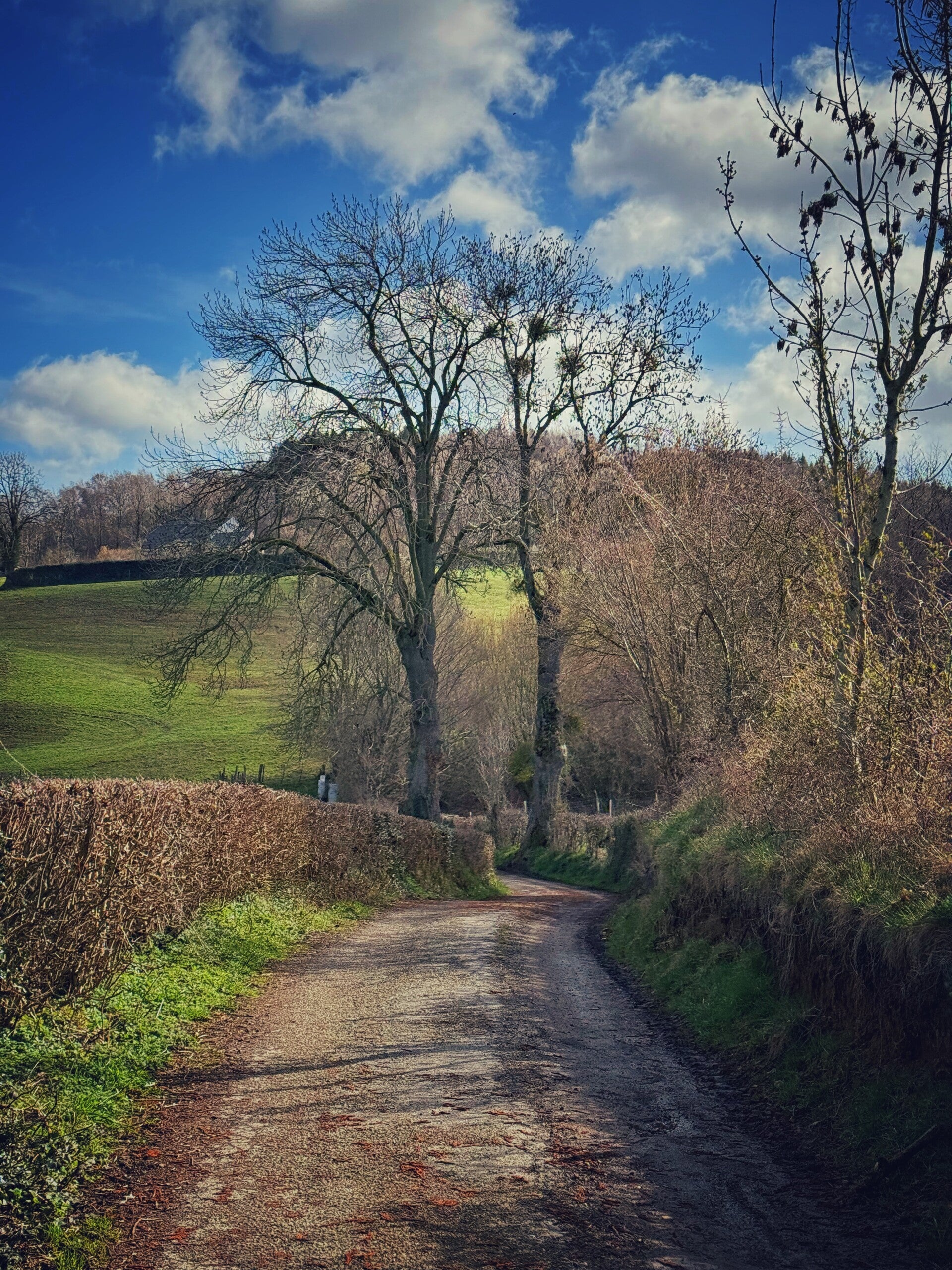 Na een tijdje veranderde het landschap plots. We liepen onder een spoorlijn door en kwamen uit het bos. En daar gebeurde iets moois. Het landschap opende zich volledig. De bossen maakten plaats voor uitgestrekte velden en zachte heuvels met prachtige vergezichten. Tegelijk verscheen ook opnieuw wat duidelijkere bewegwijzering, waardoor we eindelijk zonder constant op onze gsm te kijken verder konden wandelen. Vanaf hier begon het echt genieten.