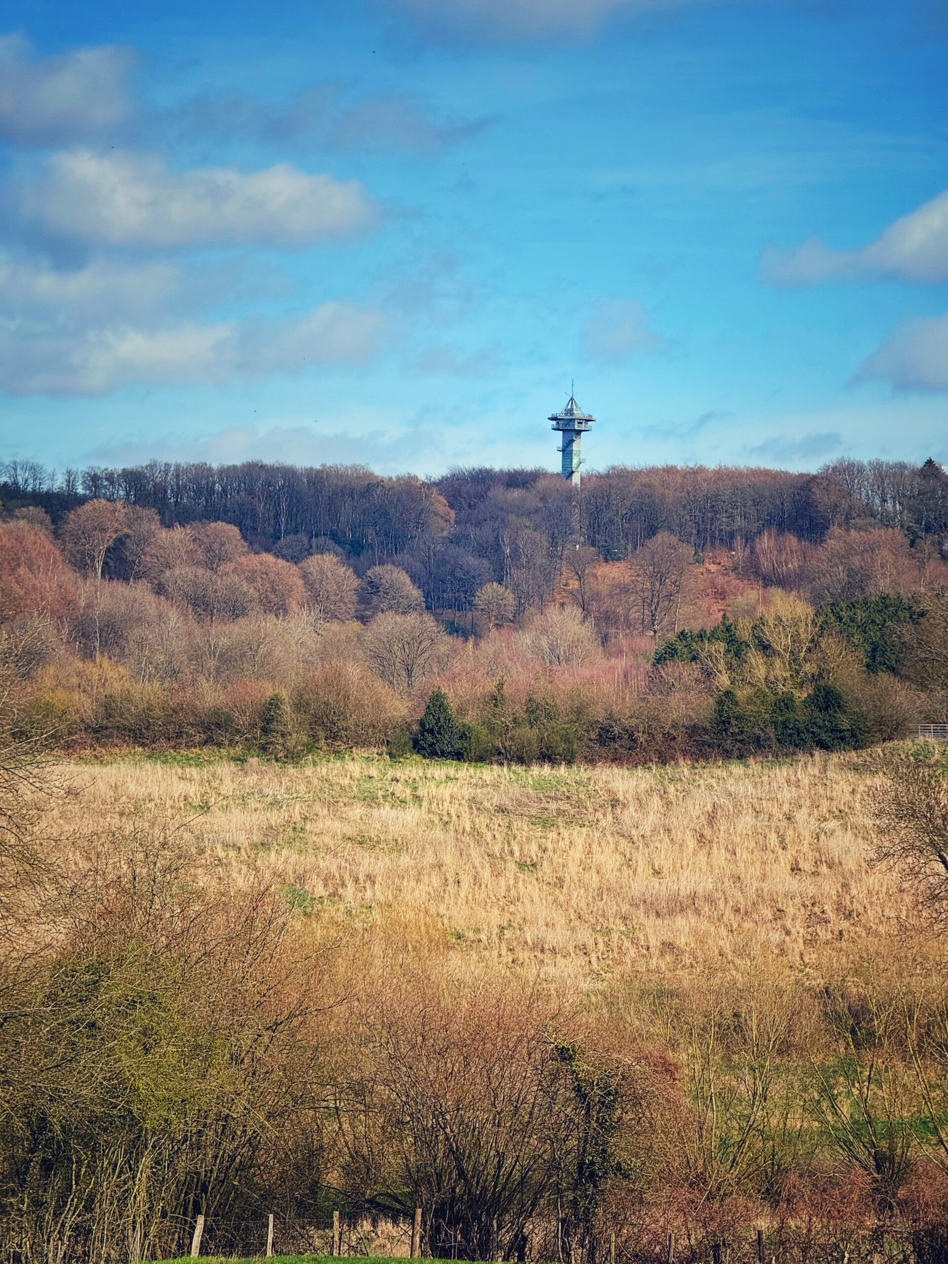 Een stukje verder schakelden we over op de route met het gele kruis. Die bracht ons geleidelijk terug richting het vertrekpunt. In de verte zagen we opnieuw de uitkijktoren op de Vaalserberg opduiken. Dat was het teken dat ons rondje stilaan op zijn einde liep. Nog een paar klimmetjes later stonden we weer waar we begonnen waren. Na bijna 9 kilometer wandelen door bossen, velden en heuvels kwamen we opnieuw uit bij het Drielandenpunt.