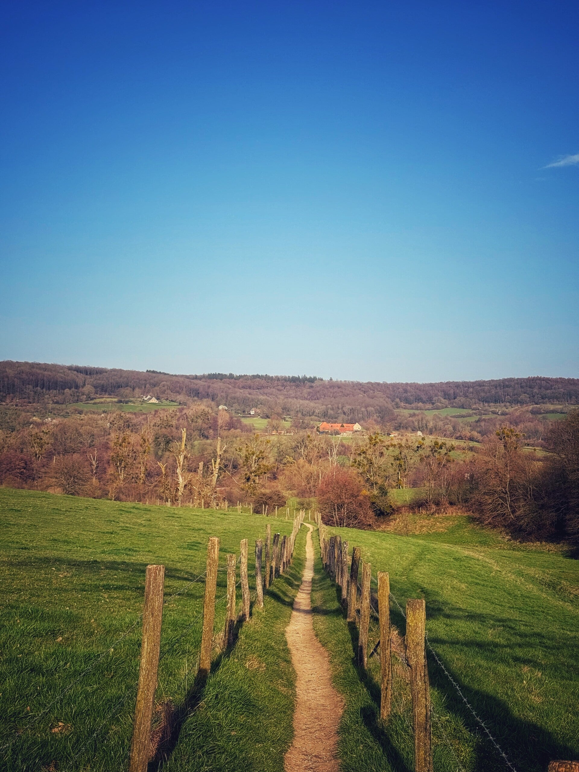 Je stapt over kleine paadjes tussen weilanden, volgt glooiende veldwegen en krijgt telkens opnieuw die weidse uitzichten. Af en toe passeer je een typische hoeve, een kasteel of een pad dat je naar een hoger punt brengt waar het landschap zich opnieuw opent.